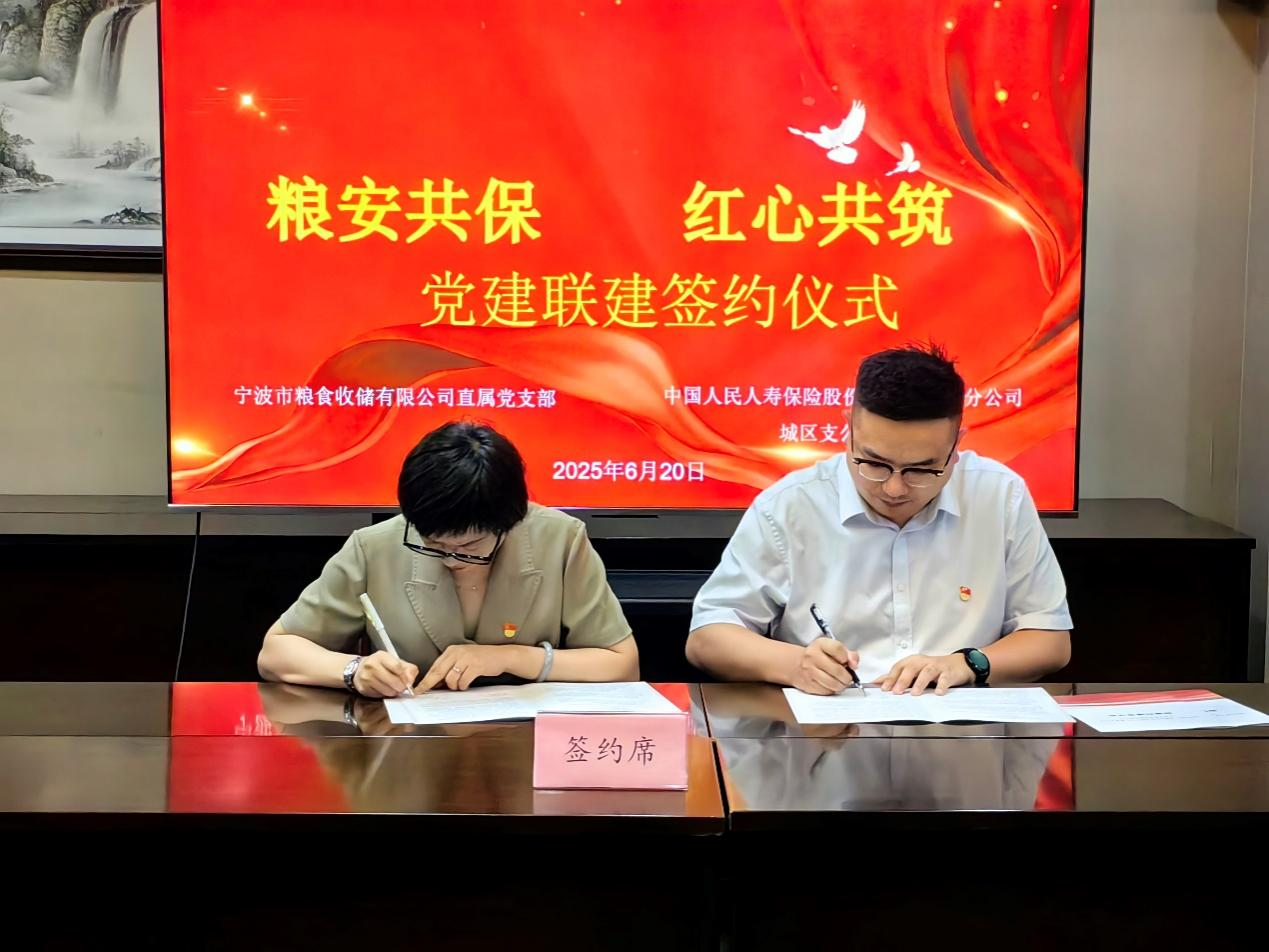 签约仪式上,在公司党总支书记、董事长林荣和中国人民人寿保险股份有限公司宁波市分公司党建工作部总经理李峰的见证下,公司直属党支部书记陈丹丹与城区支公司党支部书记陈园斌共同签署党建共建协议,明确以“组织共建、资源共享、发展共促”为目标,通过党建联建、业务协同,推动双方在粮食安全保障和金融服务领域的深度合作。